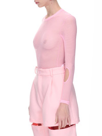 MELITTA BAUMEISTER top in pink, mesh construction, cut-out details, semi-sheer, round neck, long sleeves, fitted. US Sizing Model is 5'9" 5wearing size 2. Bust: 33" Waist: 24" Hip: 33"