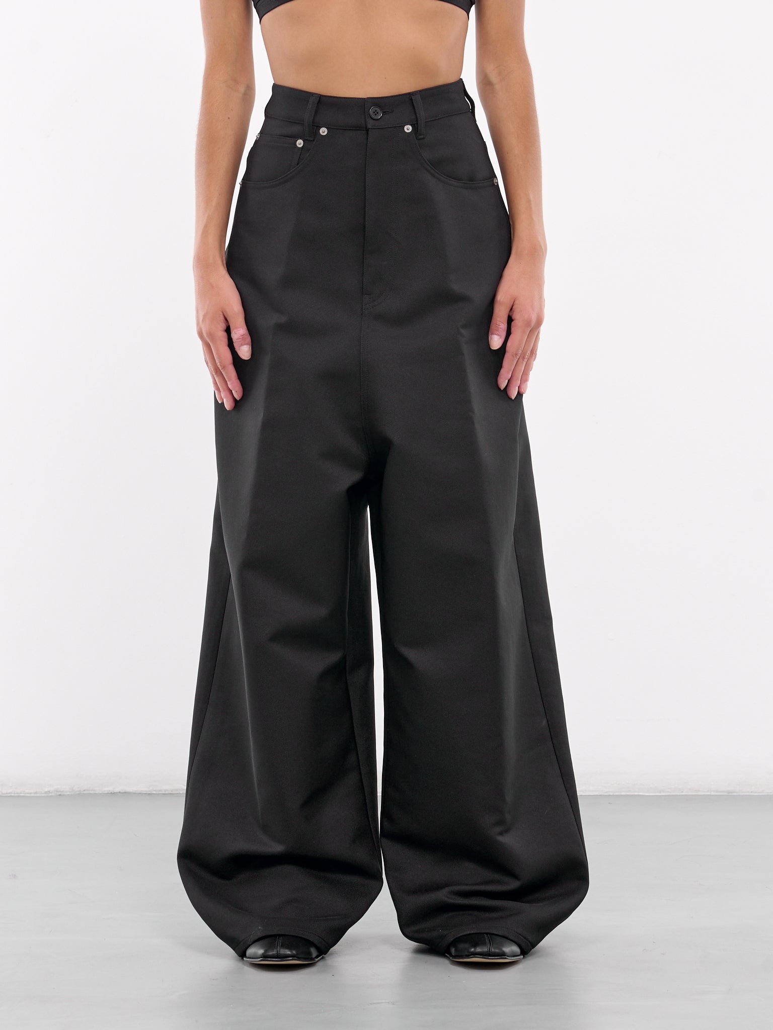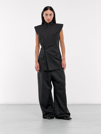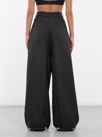 MM6 MAISON MARGIELA pants in black, paneled poly construction, high waist, belt loops, back signature stitch, front button & concealed zip fly, inset pockets, coin pocket, back patch pockets, lined, wide leg, baggy fit. Made in Italy Outer: 100% Polyester Inner: 100% Cotton Standard Sizing Model is 5'6" wearing size 26. Bust: 31" Waist: 24" Hips: 34"
