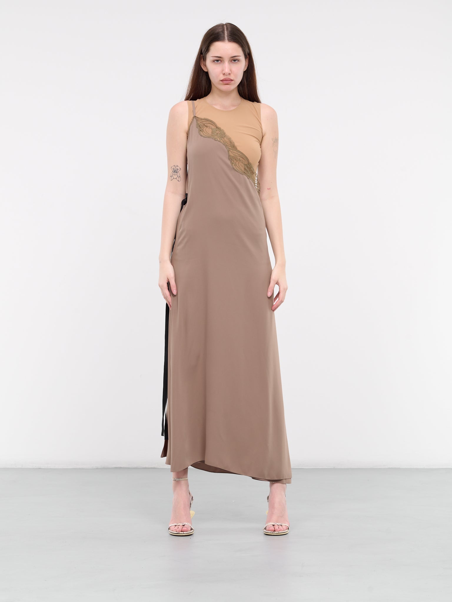 MM6 MAISON MARGIELA dress in brown, asymmetric layered design, paneled stretch nylon construction, round neck, back signature stitch detailing, sleeveless, armscyes, layered one-shoulder adjustable spaghetti strap, diagonal lace trim, side self-tie detailing, asymmetric layered hem, maxi-length, relaxed fit. Made in Italy Outer: 78% Polyamide 22% Elastane Contrast: 100% Polyester Standard Sizing Model is 5'10" wearing size S. Bust: 33" Waist: 24" Hips: 35"