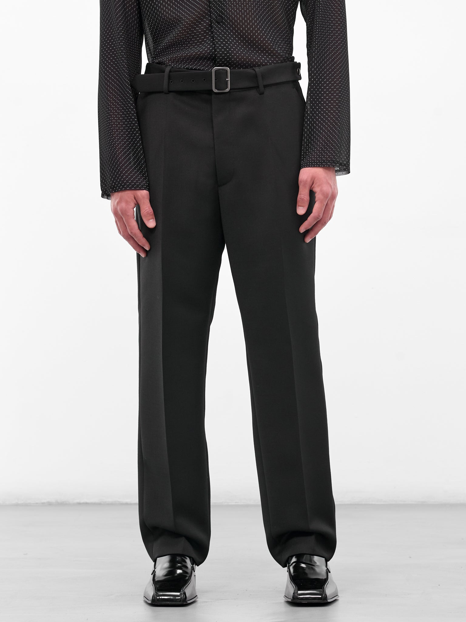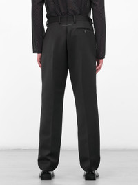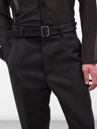 These black trousers offer a modern approach to classic tailoring with their clean, relaxed silhouette. The design is distinguished by a functional, integrated pin-buckle belt for a seamless look. Featuring: • Relaxed fit and straight leg • Integrated pin-buckle belt • Concealed zip fly closure • Three-pocket styling • Traveler's crease • Signature white stitch at the back • Italian sizing Model is 6'2" wearing size 48. Shoulders: 19" Chest: 38" Waist: 30"