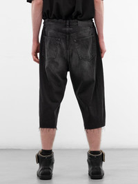Black shorts constructed in faded denim with raw hems and signature stitch detailing. Featuring: • Relaxed fit • Denim construction • Faded treatment • Belt loops • Adjustable drawstring waist • Front button and zip fly closure • Five-pocket styling • Back logo patch • Signature white stitch detailing at back • Raw hems • Below-knee length • Wide leg • Made in Romania • 100% Cotton • Italian sizing Model is 6'0" wearing size 48. Shoulders: 19" Chest: 35" Waist: 28"