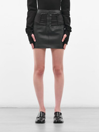 A black leather mini skirt with semi-sheer paneling and signature white stitching at the hip. The high-waisted slim cut is completed with a straight hem and concealed zip closure. Featuring: • Slim fit • Leather construction • Semi-sheer paneling • High-waisted • Front concealed zip closure • Signature white stitching at hip • Straight hem • Mini-length • Lined • Made in Italy • Main: 100% PVN | Lining: 100% Viscose • Italian sizing Model is 5'7" wearing size 38. Bust: 30" Waist: 22" Hips: 33"