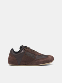These MM6 Margiela sneakers in tonal brown feature an anatomic toe and slim flat rubber sole, rendered in calf leather with smooth and suede paneling. The low-top silhouette is accented by perforated details, a contrast side panel, padded shearling-trimmed collar and tongue, numeric side signature, and white stitch line at the back. Featuring: • Low-top sneaker silhouette • Anatomic toe shape and flat rubber sole • Smooth and suede calf leather panels • Perforated toe box and contrast side panel • Lace-up closure and eyelets • Padded collar and tongue with shearling trim • Numeric side signature and white stitch line at heel • Made in Italy • Upper: 100% Calf Leather | Contrast: 100% Calf Leather | Lining: 60% Cotton 40% Polyester | Inside: 100% Calf Leather | Sole: 100% Rubber • Italian sizing