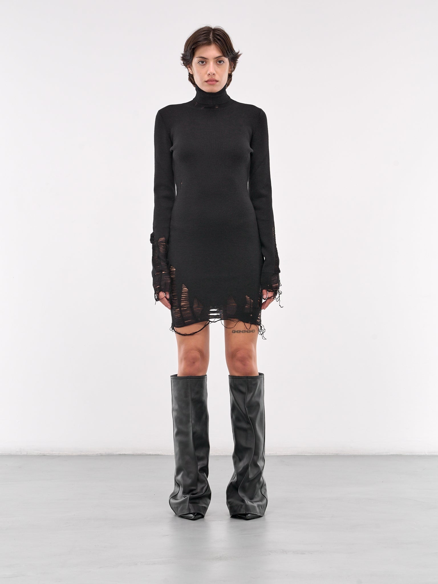 MM6 MAISON MARGIELA dress in black, wool-acrylic blend, paneled knit construction, heavy distressing throughout, ribbed turtleneck, long sleeves, asymmetric hem, mini-length, slim fit. Made in Romania 50% Wool 50% Acrylic Standard Sizing Model is 5'8" wearing size S. Bust: 32" Waist: 24" Hips: 36"