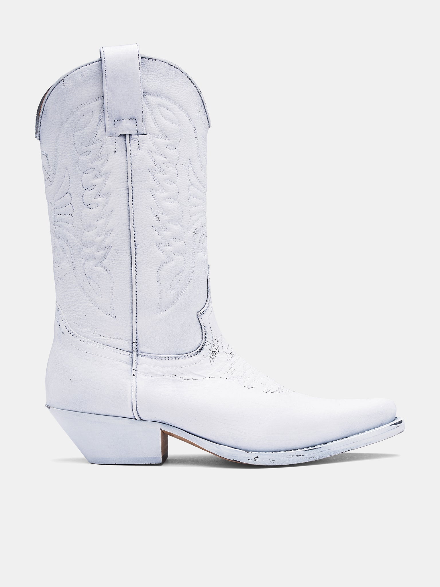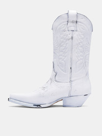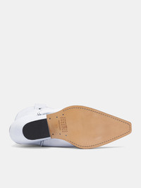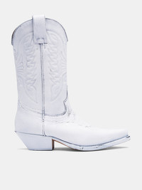 MM6 MAISON MARGIELA boots in white, paneled calfskin leather construction, all-over signature vintage painted effect, western style embroidery, cowboy curved hem, side pull tabs, vamp western overlay, Cuban heel, pointed square toe, footbed & insole signature numeric logo, leather sole, leather lining. Made in Spain 100% Calfskin Italian Sizing