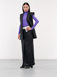 MM6 MAISON MARGIELA bodysuit in purple, paneled lycra jersey construction, turtleneck, long sleeves, back graphic print & chest logo numeric print, form fit. Made in Italy 75% Nylon 25% Elastane Standard Sizing Model is 5'6" wearing size XS. Bust: 31" Waist: 24" Hips: 34"