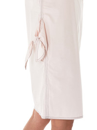 MM6 Maison Margiela draped asymmetric short dress in light pink, contrast-color topstitching, off-shoulder silhouette, cloth ties at the shoulder and sides, cap right sleeve, straight hem, and slim-fit throughout. Made in Italy. Composition - 100% Cotton Model wears a size 38.