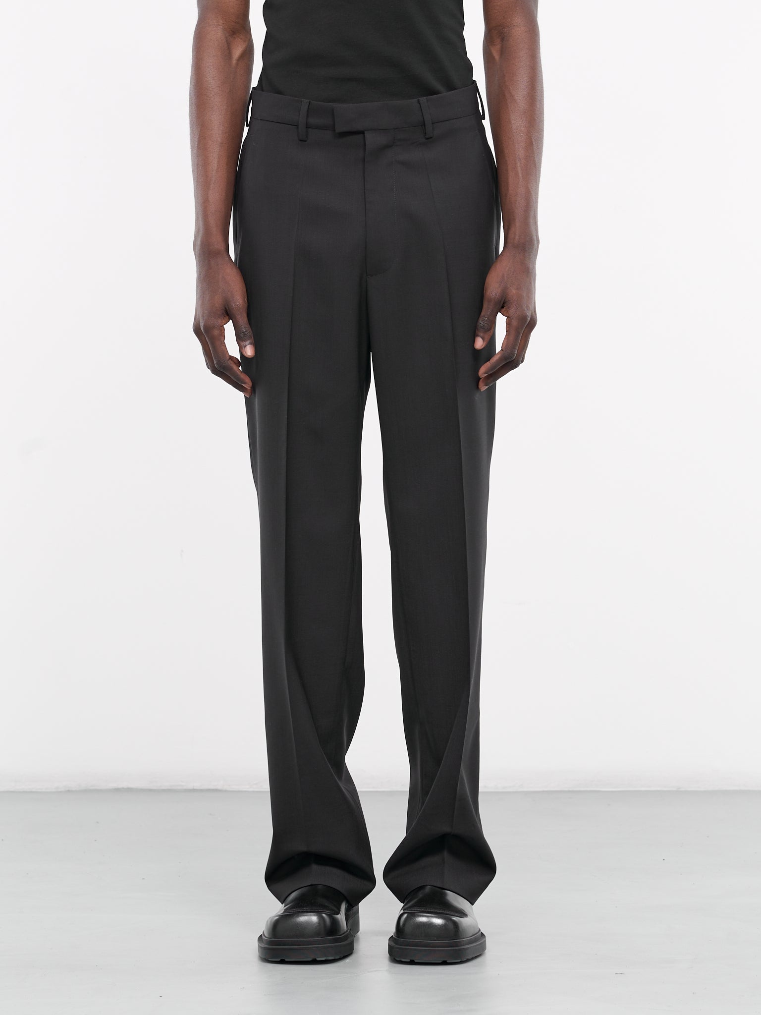 MM6 MAISON MARGIELA pants in black, paneled construction, belt loops, front concealed zip fly closure, back signature stitch detailing, traveler's crease, side seam pockets, back buttoned welt pocket, straight leg, slim fit. Made in Italy European Sizing Model is 6’2” wearing size 48. Shoulders: 19” Chest: 38” Waist: 28”
