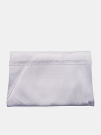 Featuring: • Rectangular clutch bag • Mesh texture • Button snap closure on metallic clasp • Knotted detail on flap with cylindrical clasp • Diagonal cutout revealing dark layer • Slim zippered pocket on back • Subtle tonal stitching along edges • Metallic logo detail at bottom corner • White stitch line at the back • Body: 100% Polyester | Coating: 100% Polyurethane | Lining: 100% Cotton • Standard sizing