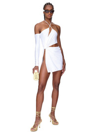 Monot dress in white, cross over halter neck collar featuring asymmetric keyhole design, single long sleeve, mini length silhouette, let slit detailing, asymmetric hemline. Made in the United States. Numeric Sizing. Model is 5'8" and wearing a size 0. Bust: 32" Waist: 25" Hip: 34"