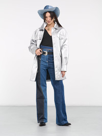 M05CH1NO JEANS jacket in silver, paneled construction, coated fabric, spread collar, front buttoned placket closure, dropped shoulders, long sleeves, double-button barrel cuffs, chest & waist flap pockets, side vents, logo-engraved hardware, straight hem, mini-length, oversized fit. Italian Sizing Model is 5'8" wearing size 40. Bust: 32" Waist: 26" Hips: 34.5"