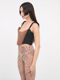 MUGLER corset in brown & black, corset top design, paneled bi-material denim construction, two-tone dye, tapered shoulder straps, curved neckline, pointed edges, sleeveless, armscyes, side concealed zip closure, dipped hem, cropped length, fitted. Made in Italy 72% Cotton 28% Elastomultiester French Sizing Model is 5'8" wearing size 36. Bust: 32" Waist: 26" Hips: 34.5"
