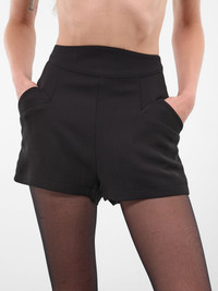 Black mini shorts in viscose-wool blend with high waist, concealed back zipper, and side flap pockets. Featuring: • Tailored fit • High-waisted • Concealed zipper in back with snap button • Side flap pockets • Mini length • Fully lined • Remake From the Lingerie pret-a-porter collection fall/winter 1998-1999 • Made in Ukraine • Main Fabric: 78% Viscose 22% Wool | Lining: 100% Cupro • French sizing Model is 5'9" wearing size 36. Bust: 32" Waist: 23" Hips: 34"