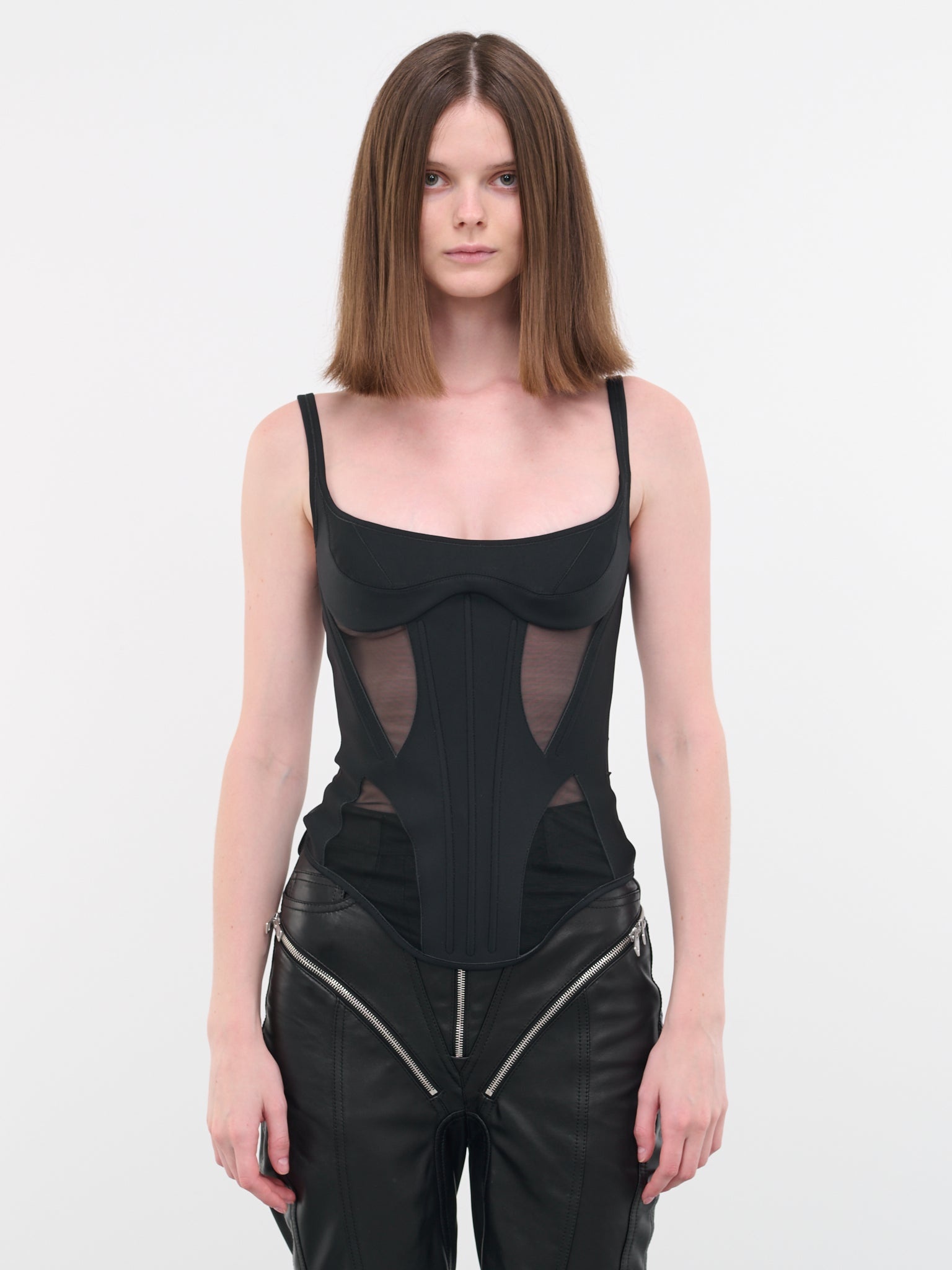 MUGLER top in black, illusion corset design, mesh inserts, square neckline, adjustable straps, curved hem, fitted. Made in Ukraine Italian Sizing 78% Polyamide, 22% Spandex Model is 5'10" wearing size 36. Bust: 32" Waist: 24" Hips: 35"