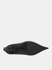 MUGLER boots in black, paneled denim upper, mid-top, side zip closure, leather heel & toe cap, stiletto heel, pointed toe, leather sole. European Sizing
