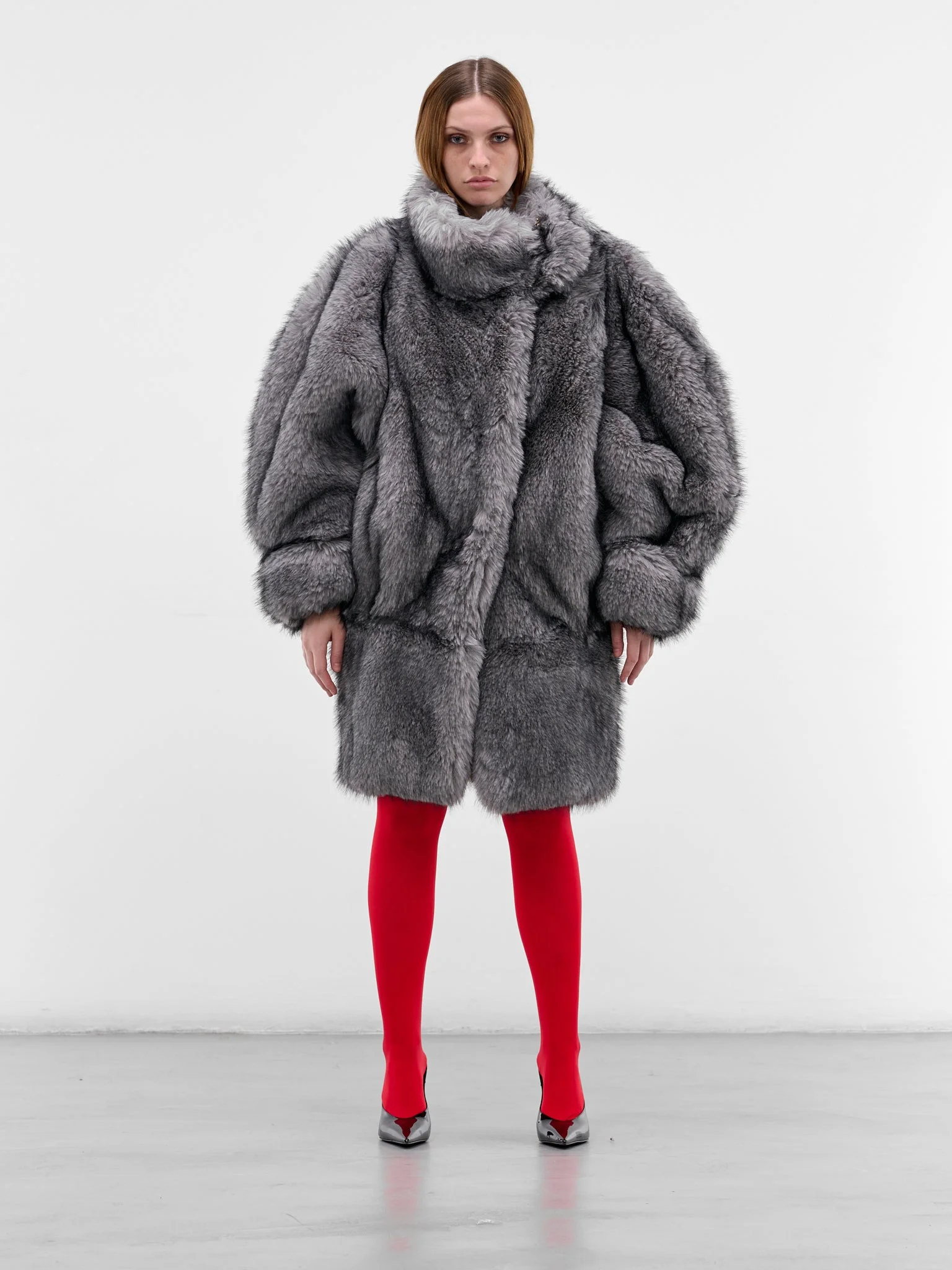 Featuring: • Oversized fit • Faux fur construction • Gray two-tone color • Wide stand collar with hook closure • Front hidden hook closure • Long sleeves • Two large patch pockets • Fully lined • Remade from the Hiver Pop pret-a-porter collection fall/winter 1985–1986 • Made in Ukraine • Main fabric: 100% Polyester | Lining: 100% Cupro • Standard sizing Model is 5'7" wearing size S. Bust: 32” Waist: 22” Hips: 34”