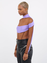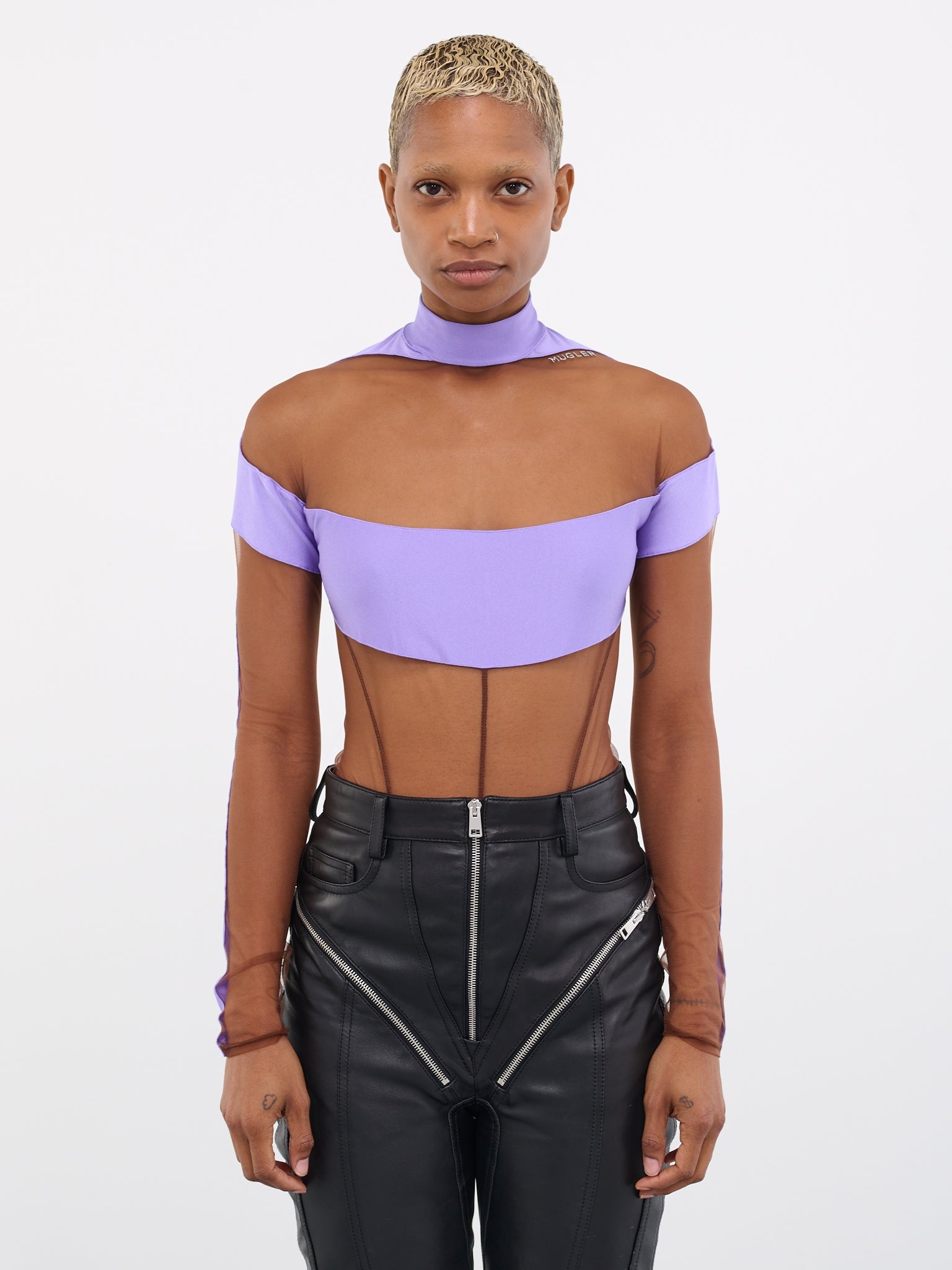 MUGLER bodysuit in purple, signature illusion design, paneled construction, sheer stretch nylon tulle & satin, metal logo detail, mock neck, long sleeves, bottom press-stud fastening, back zip closure, partial lining, fitted. Made in Portugal Italian Sizing Body 1 - 80% Nylon, 20% Elastane Body 2 - 77% Nylon, 23% Elastane Lining - 100% Cotton Model is 5'7" wearing size 36. Bust: 32" Waist: 24" Hips: 34"