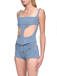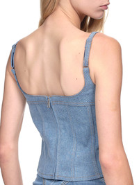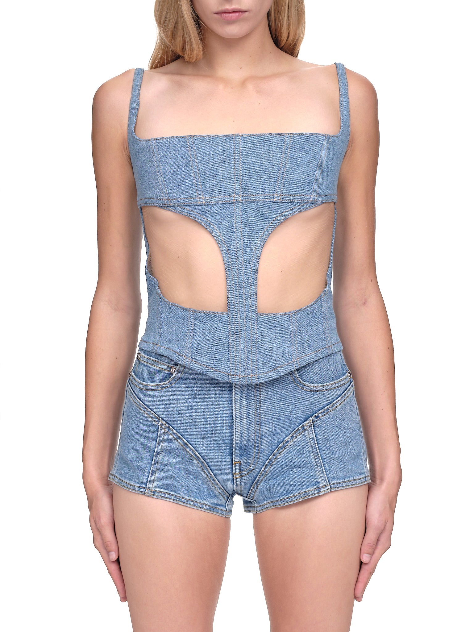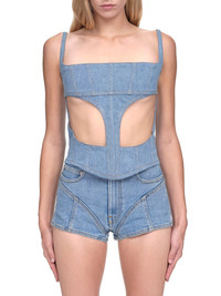 Mugler cotton blend corset top in light wash indigo/nude. Square neckline, sleeveless, adjustable straps, boning details throughout, back zip closure, sheer tulle panels at mid section. Made in Portugal French Sizing Composition: (Main) 100% Cotton Model is 5ft 8” and is wearing a size 34. Bust: 33” Waist: 24” Hip: 34"