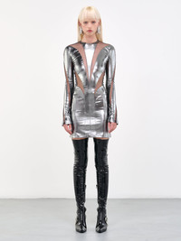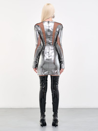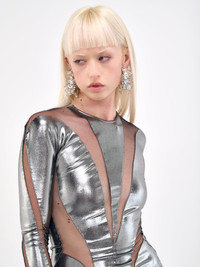 MUGLER dress in silver, signature illusion design, metallic stretch jersey, tulle inserts, round neck, long sleeves, back zip closure, mini length, fitted. Made in Bulgaria Italian Sizing Main - 78% Polyamide, 22% Elastane Second - 77% Polyamide, 23% Elastodiene Model is 5'8" wearing size 36. Bust: 30" Waist: 24.5" Hips: 34"