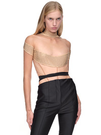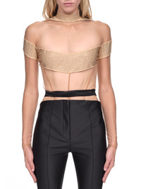 Mugler bodysuit in beige/sheer. Mock neckline, long sleeves, mix of sheer tulle panels, back zip closure, tonal rhinestone appliqué throughout. Made in Portugal French Sizing Composition: (Main) 80% Polyamide, 20% Elastane, (Secondary) 77% Polyamide, 23% Elastane Model is 5ft 8” and is wearing a size 36. Bust: 33” Waist: 24” Hip: 34"