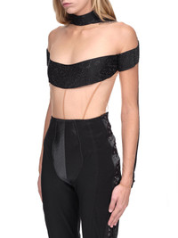Mugler bodysuit in black/sheer. Mock neckline, long sleeves, mix of sheer tulle panels, back zip closure, tonal rhinestone appliqué throughout. Made in Portugal French Sizing Composition: (Main) 80% Polyamide, 20% Elastane, (Secondary) 77% Polyamide 23% Elastane Model is 5ft 8” and is wearing a size 36. Bust: 33” Waist: 24” Hip: 34"