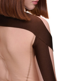 MUGLER top in brown nude, paneled construction, jersey & stretch-nylon tulle, mock neck, logo plaque, press stud fastening, long sleeves, back zip closure, form-fitting. Made in Portugal French Sizing Main - 78% Polyamide, 22% Elastane Second - 77% Polyamide, 23% Elastane Model is 5'7" and is wearing size 34. Bust: 32" Waist: 25" Hip: 37"