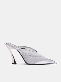 MUGLER heels in silver, mules design, paneled mesh construction, semi-sheer, low-top, slip-on style, open back, modified metallic stiletto heel, pointed toe, logo embossed footbed, rubber-injected heel, leather sole. Made in Italy Upper: Mesh Inner: 100% Leather Sole: 80% Leather 20% Rubber European Sizing