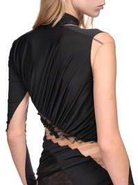 Mugler swirling patchwork dress in black/sheer, illusion gathered panels, cut-out on the shoulder, asymmetric silhouette. Made in Portugal Italian Sizing Composition: 77% Polyamide, 23% Elastane Model is 5ft 8” and is wearing a size 36. Bust: 33” Waist: 24” Hip: 34"