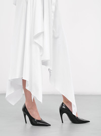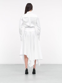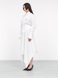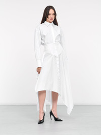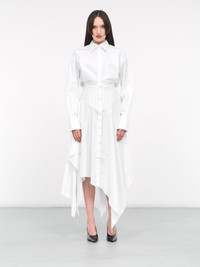 MUGLER dress in white, paneled cotton poplin construction, spread collar, front concealed button placket closure, mother-of-pearl buttons, long sleeves, double-button barrel cuffs, structured corset-style waist, hem ruffling & draping, asymmetric hemline, maxi-length, relaxed fit. Made in France 100% Cotton French Sizing Model is 5'8" wearing size 36. Bust: 32" Waist: 26" Hips: 34.5"