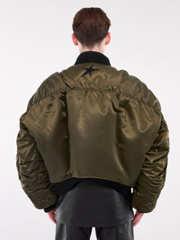 MUGLER jacket in green, paneled nylon construction, satin weave, ruching throughout, ribbed stand collar, front exposed zip closure, long sleeves, rib-knit cuffs & hem, curved hem, lined, oversized fit. Made in Ukraine Outer: 100% Nylon Inner: 100% Cupro Standard Sizing Model is 6’0” wearing size L. Shoulders: 19" Chest: 38” Waist: 30”