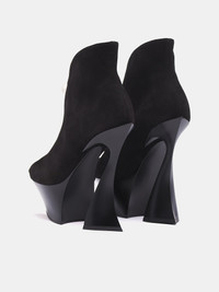 MUGLER heels in black, suede construction, angled sculptural design, low-cut, pearl embellished loop fastening, vamp cut-out, pointed toe, sculptural heel, platform sole, lined. Italian Sizing