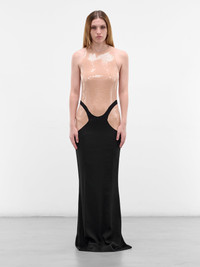 Featuring: • Slim fit • Sequin mesh and stretch crepe georgette construction • Beige and black color combination • Round neck • Sleeveless design • Trompe-l’œil cut-out skirt silhouette • Invisible back zipper • Flared floor-length skirt • Lined interior • Remade from the Jeu de Paume couture collection spring/summer 1998 • Made in Portugal • Main fabric: 96% Viscose 4% Elastane | Second fabric: 65% Acetate 35% Silk | Lining: 100% Cupro • French sizing Model is 5'7" wearing size 36. Bust: 32” Waist: 22” Hips: 34”