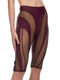 Mugler shorts in burgundy, high waisted, spiral paneled construction featuring sheer tulle, bodycon fit, silver-tone branded logo detailing at the hip. Made In Bulgaria. Composition: 78% Polyamide 22% Elastane. Italian Sizing. Model Measurements: Model is 5ft 8” and wearing a size 34. Bust: 32” Waist: 24” Hip: 34"