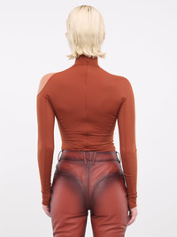 MUGLER brown & nude bodysuit, partially sheer design, stretch nylon construction, abstract swirl paneling, high-neck, elongated sleeves, thumbholes, high-cut, form fit. Made in Portugal 78% Polyamide 22% Elastane French Sizing Model is 5'9" wearing size 34. Bust: 32" Waist: 24" Hips: 34"