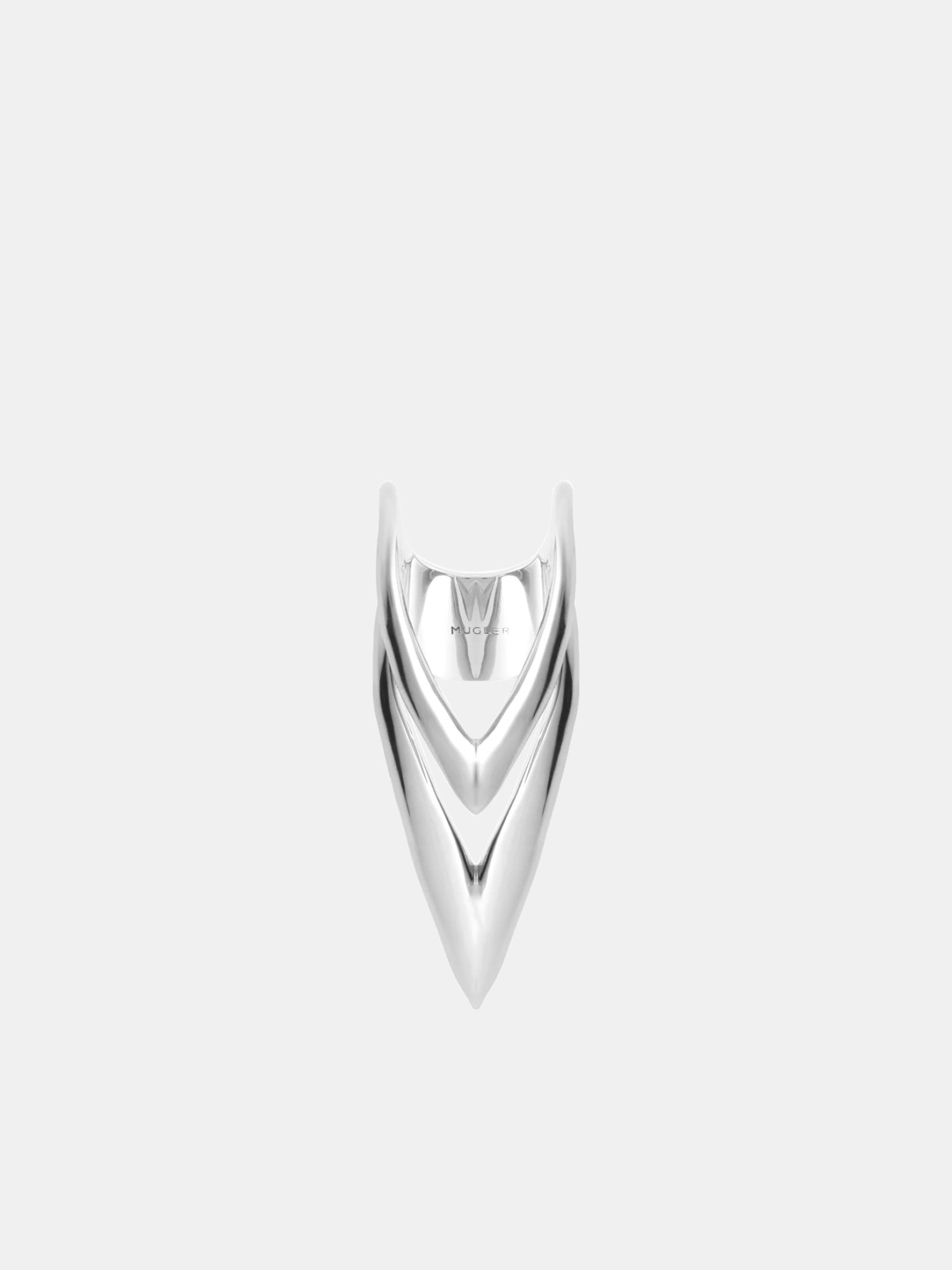 MUGLER silver-tone ring, signature v-shaped design, brass construction, engraved logo. Made in Thailand 100% Brass Ring Sizing