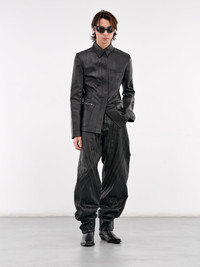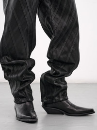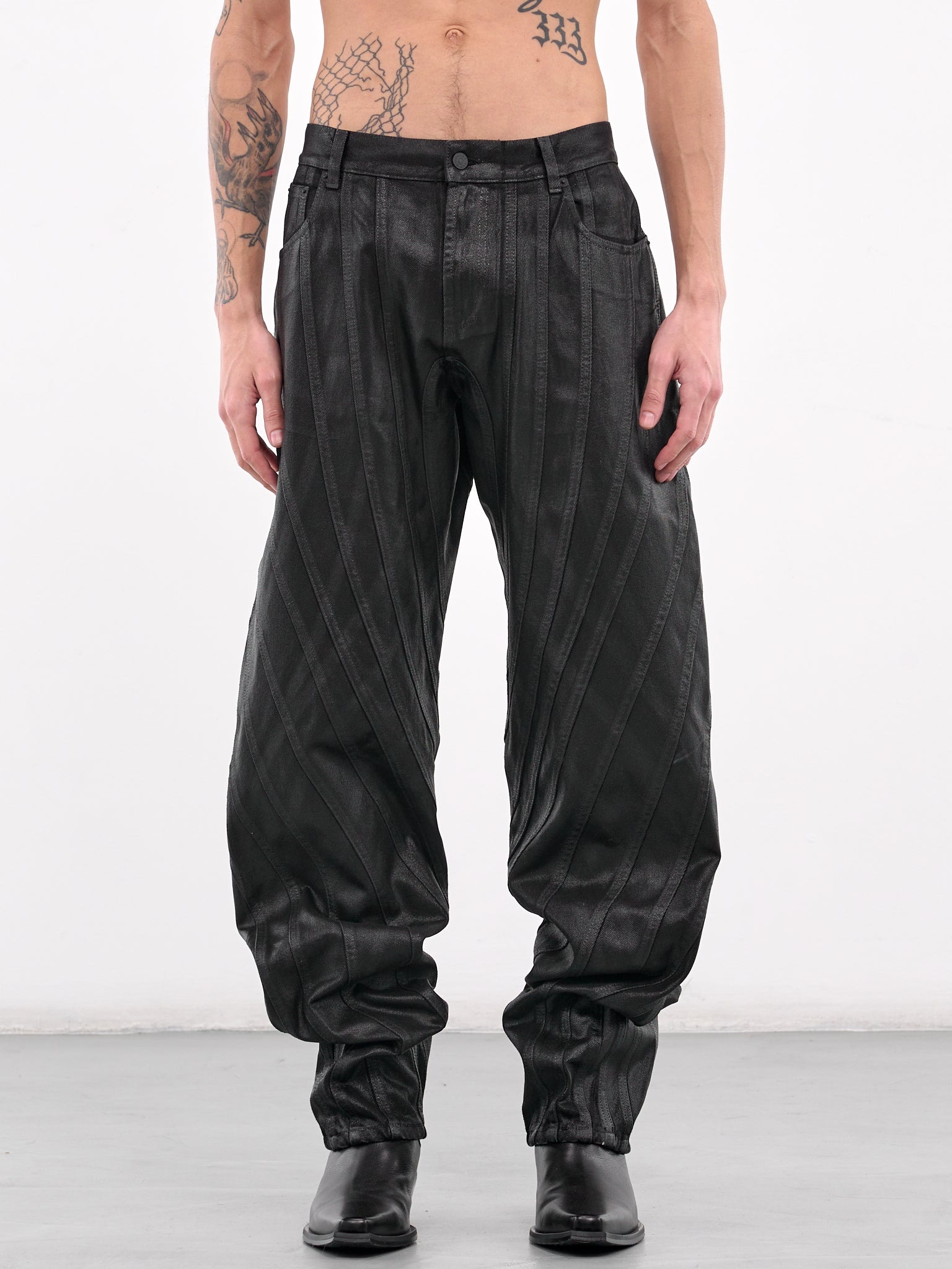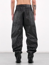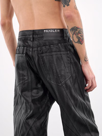 MUGLER jeans in black, paneled denim construction, waxed, signature spiral construction, belt loops, back logo patch, front button & concealed zip fly closure, inset pockets, coin pocket, back patch pockets, wide leg, baggy fit. Made in Slovakia 100% Cotton Standard Sizing Model is 6'1” and wears a size 32. Shoulders: 17” Chest: 33” Waist: 30”