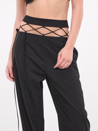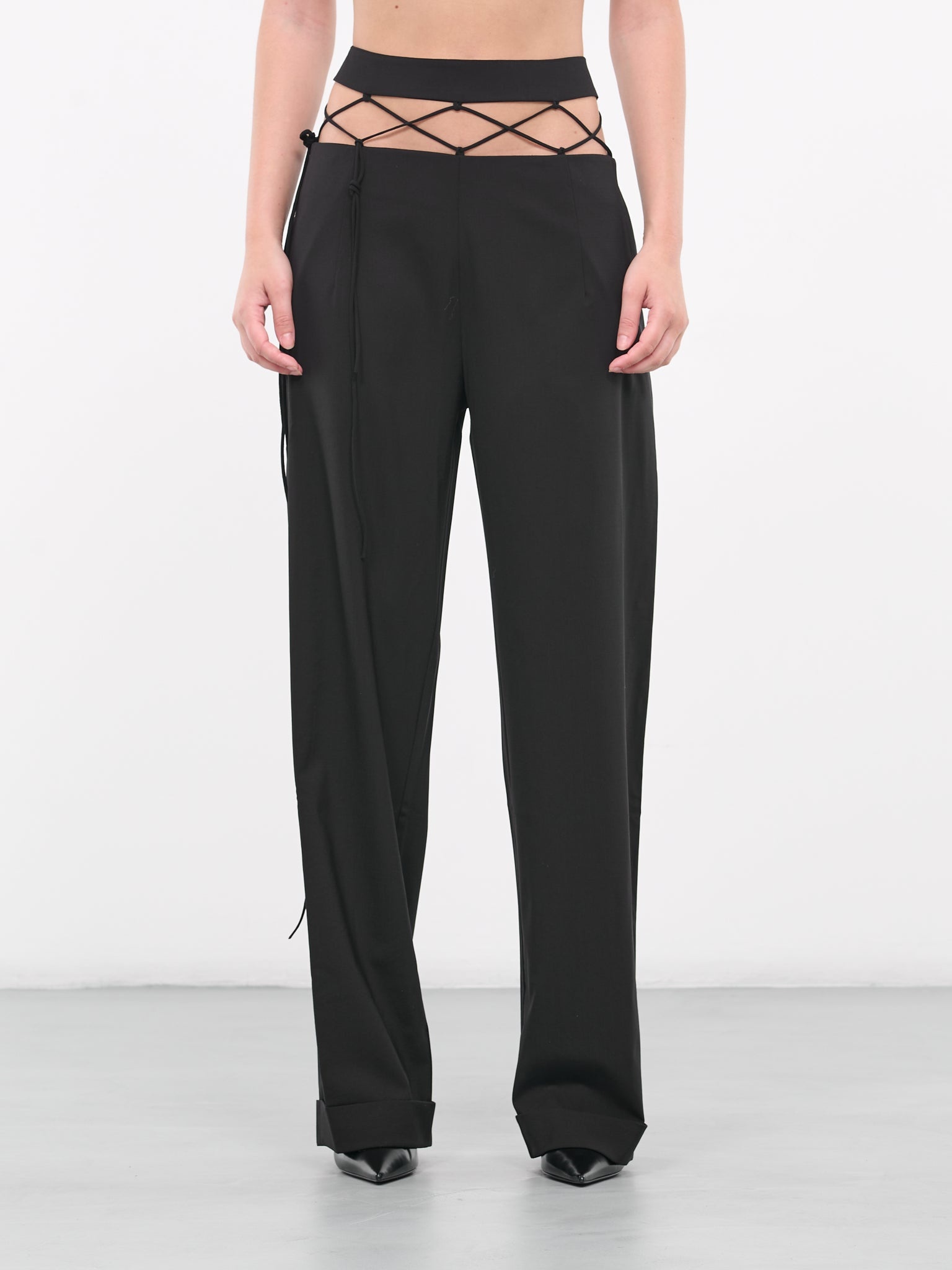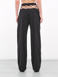 NENSI DOJAKA black pants, double waist design, fishnet layer, high & low waist, cord detail, folded cuffs, back velcro & concealed zip closure, wide leg, loose fit. Standard Sizing Model is 5'9" wearing size S. Bust: 32" Waist: 24" Hips: 34"
