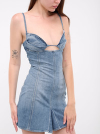 NENSI DOJAKA dress in blue, paneled denim construction, sweetheart neckline, spaghetti straps, sleeveless, armscyes, partially open back, back exposed zip closure, bust godet embellishment, front cut-out, pleated hem, mini-length, slim fit. Made in Italy 100% Cotton Standard Sizing Model is 5'10" wearing size S. Bust: 33" Waist: 24" Hips: 35"