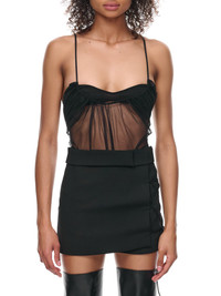 NENSI DOJAKA top in black, stretch nylon mesh, silk crepe, gathered elasticized jersey trim, layered construction, adjustable & detachable spaghetti straps, press-stud fastening at bottom, back hook eye fastening, fitted. Made in Italy Standard Sizing Body - 82% Polyamide, 18% Elastane Second - 88% Silk, 12% Elastane Model is 5'10" wearing size XS. Bust: 34" Waist: 25" Hip: 35"