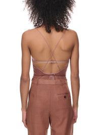 NENSI DOJAKA top in brown, stretch nylon mesh, silk crepe, gathered elasticized jersey trim, layered construction, adjustable & detachable spaghetti straps, press-stud fastening at bottom, back hook eye fastening, fitted. Made in Italy Standard Sizing Body - 82% Polyamide, 18% Elastane Second - 88% Silk, 12% Elastane Model is 5'10" wearing size XS. Bust: 34" Waist: 25" Hip: 35"