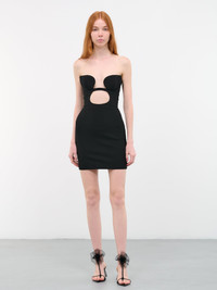 NENSI DOJAKA dress in black, volute padded bra, strapless, center cut-out, cinched waist, back zip closure, mini length, fitted. Made in Italy Standard Sizing 83% Viscose, 12% Polyamide, 5% Elastane Model is 5'9" wearing size S. Bust: 31.5" Waist: 23" Hips: 34"