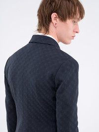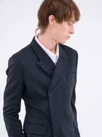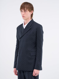 NIKE x MARTINE ROSE blazer in navy, double-breasted design, jacquard woven logo, notched lapel collar, concealed button closure, surgeon cuffs, chest welt pocket, side flap pockets, back vent, branded lining, tailored fit, gender-neutral. Made in Italy Numeric Sizing 100% Wool Model is 5'11" wearing size 8. Shoulders: 18" Chest: 34" Waist: 29" SHIPS WITHIN U.S. ONLY