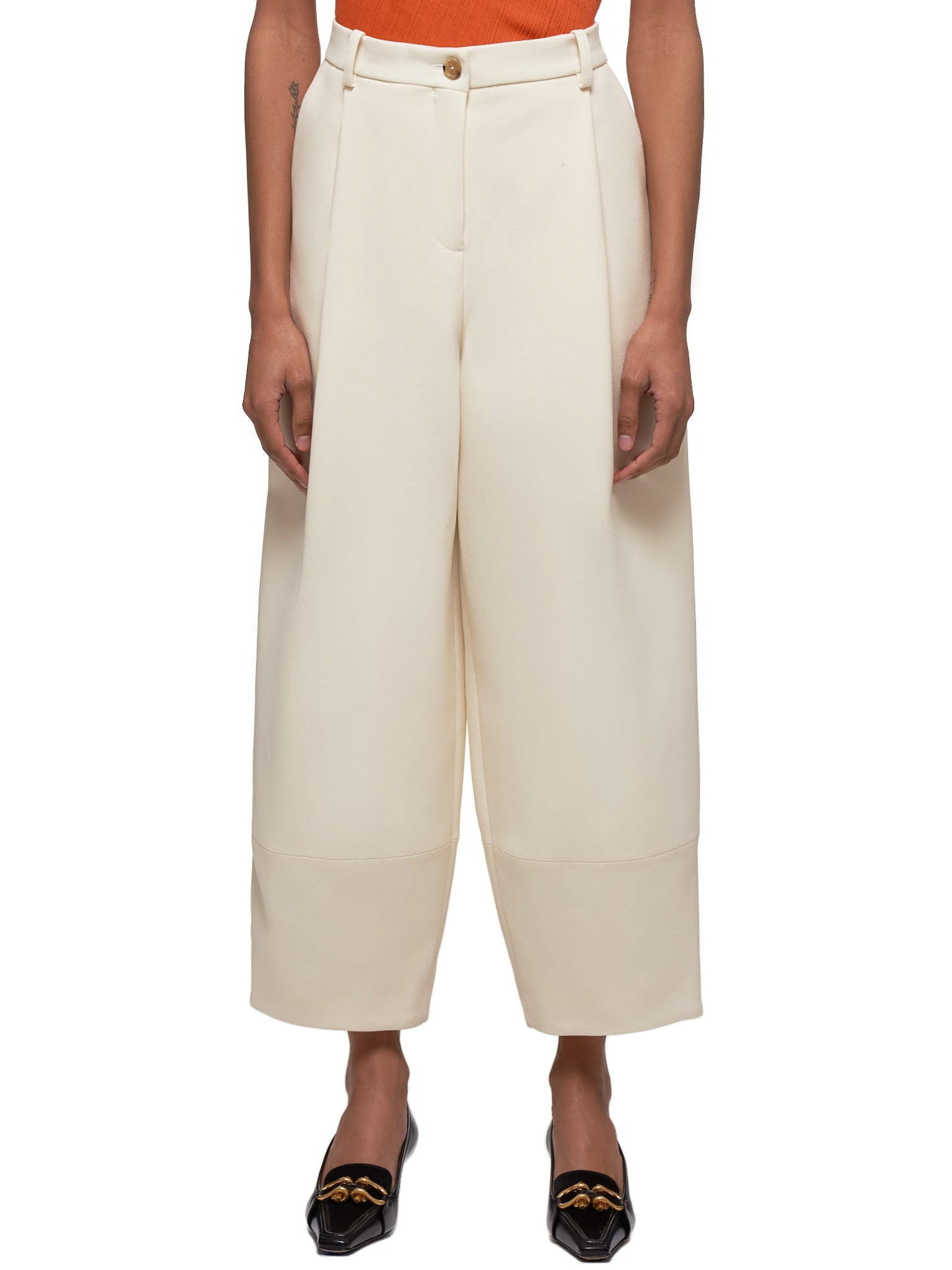 Nina Ricci wool trousers in cream, high-rise, button waist closure, belt loops, dropped crotch with zippered fly, slash hand pocket, crisp pleated details, wide legs, straight/finished hem, tonal stitching. Made in Portugal. Composition - 90% Wool, 10% Polyamide Model is 5ft 8” and wearing a size 38. Bust: 32” Waist: 26” Hip: 36"