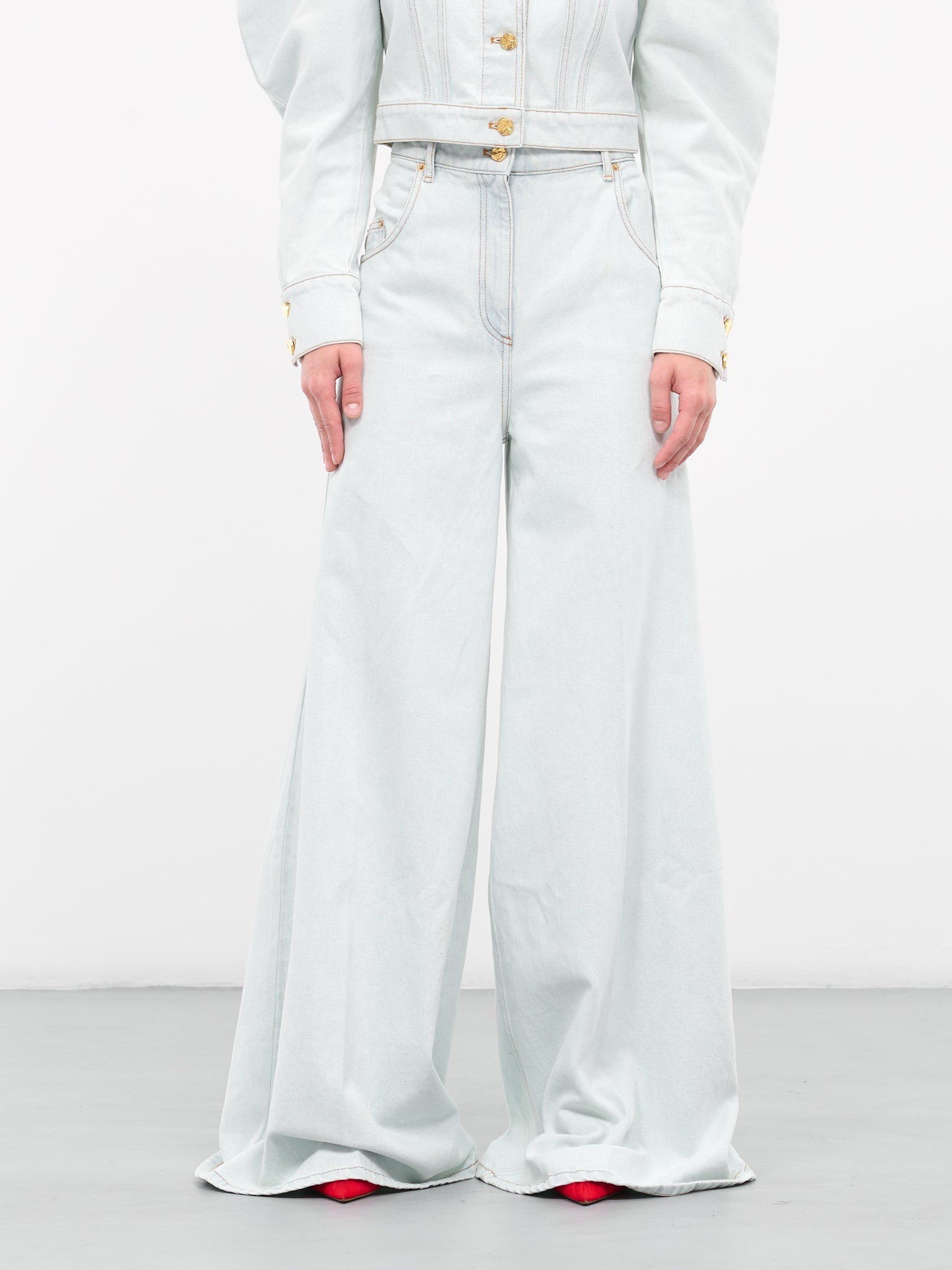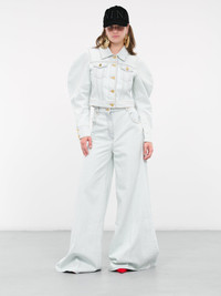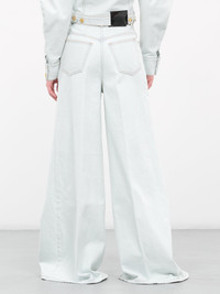 NINA RICCI blue jeans, flared silhouette, bleached denim, high-waist, belt loops, button & zip-fly, five pockets, embossed jacron patch, denim topstitching, full length, regular fit. 100% Cotton Italian Sizing Model is 5'9" wearing size 36. Bust: 32" Waist: 24" Hips: 34"