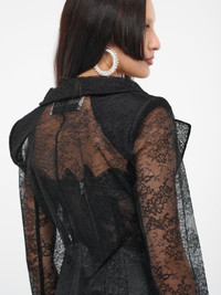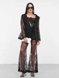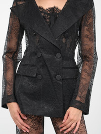 NINA RICCI jacket in black, double-breasted design, lace construction, semi-sheer, notched lapel collar, button closure, flap pockets, back vent, fitted. Italian Sizing 73% Polyamide, 27% Viscose Model is 5'8" wearing size 36. Bust: 32" Waist: 26" Hips: 34.5"