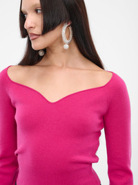 NINA RICCI top in pink, wool-blend knit, sweetheart neckline, long sleeves, fitted. Standard Sizing 83% Wool, 17% Polyester Model is 5'8" wearing size S. Bust: 32" Waist: 26" Hips: 34.5"
