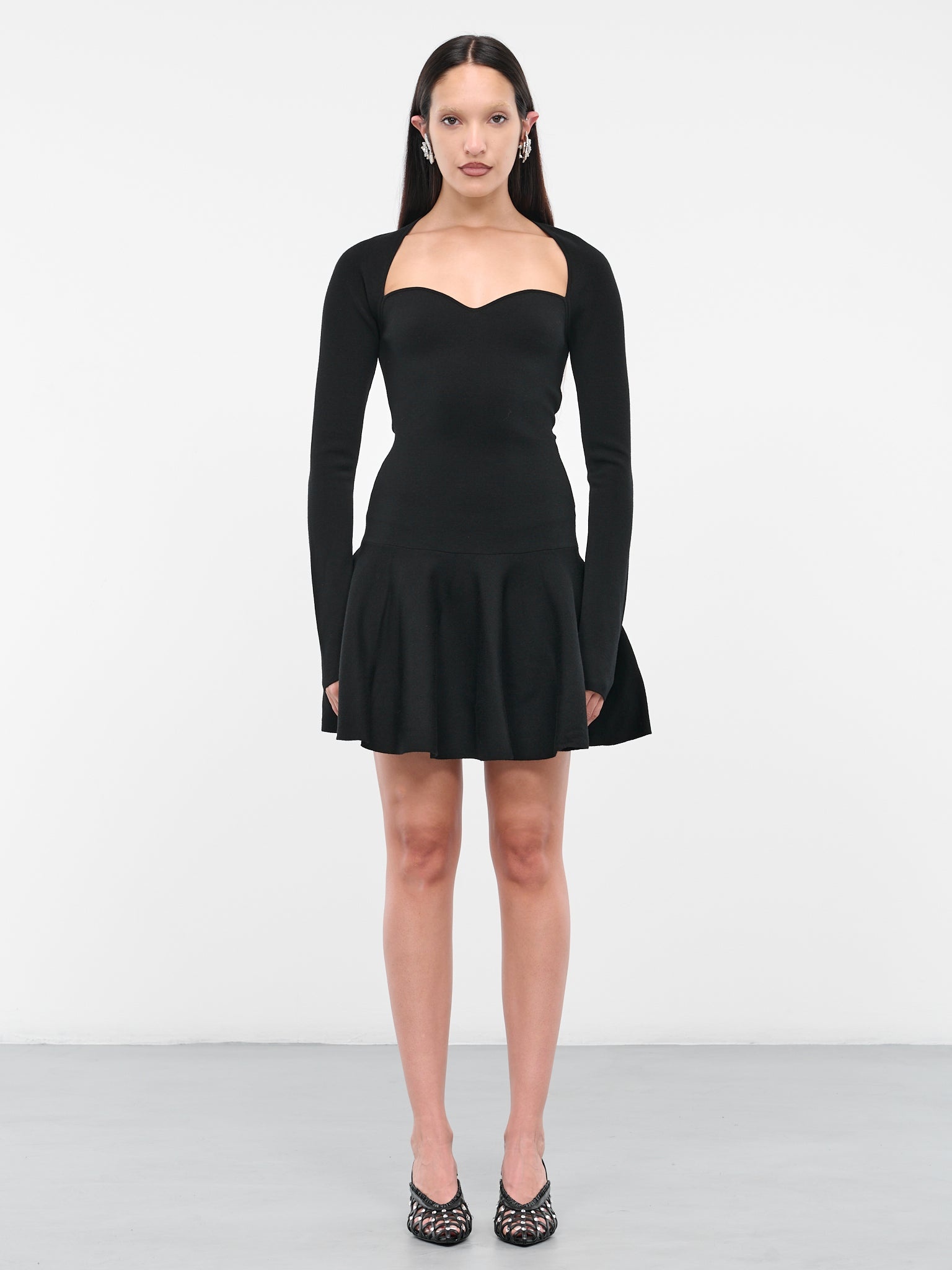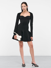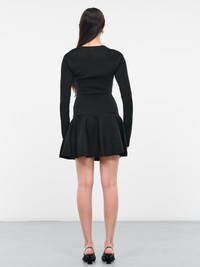 NINA RICCI top in black, wool-blend knit, sweetheart neckline, elongated sleeves, ruffled hem, mini length, fitted. Standard Sizing 83% Wool, 17% Polyester Model is 5'8" wearing size S. Bust: 32" Waist: 26" Hips: 34.5"