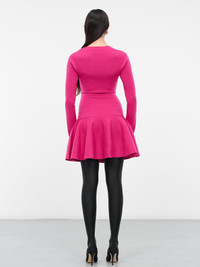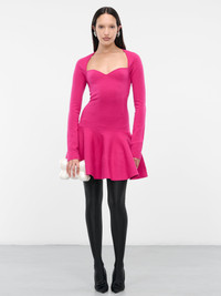 NINA RICCI top in pink, wool-blend knit, sweetheart neckline, elongated sleeves, ruffled hem, mini length, fitted. Standard Sizing 83% Wool, 17% Polyester Model is 5'8" wearing size S. Bust: 32" Waist: 26" Hips: 34.5"