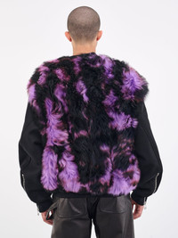 OAMC jacket in black purple, paneled vest design, tie-dye faux-fur, round neck, dual-end zip closure & cuffs, ribbed elasticized trim, relaxed fit. Standard Sizing Model is 6'0" wearing size L. Shoulders: 20” Chest: 38” Waist: 30"
