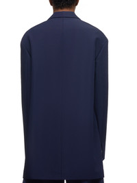 OAMC virgin fleece wool suit jacket in navy, notched lapels, buttoned closure, concealed inner chest pockets, concealed cardholder pocket, front waist pockets, long sleeves, layered/vented cuffs with buttoned closure, straight/finished hem, tonal stitching. Made in Italy. Composition - 86% Lana Virgin Fleece Wool, 14% Mohair (Main); 50% Cupro, 50% Viscose (Secondary Fabric); 100% Cotton (Additional Fabric) Model is 6ft 2” and wearing a size 46. Shoulders: 22” Chest: 37” Waist: 28”